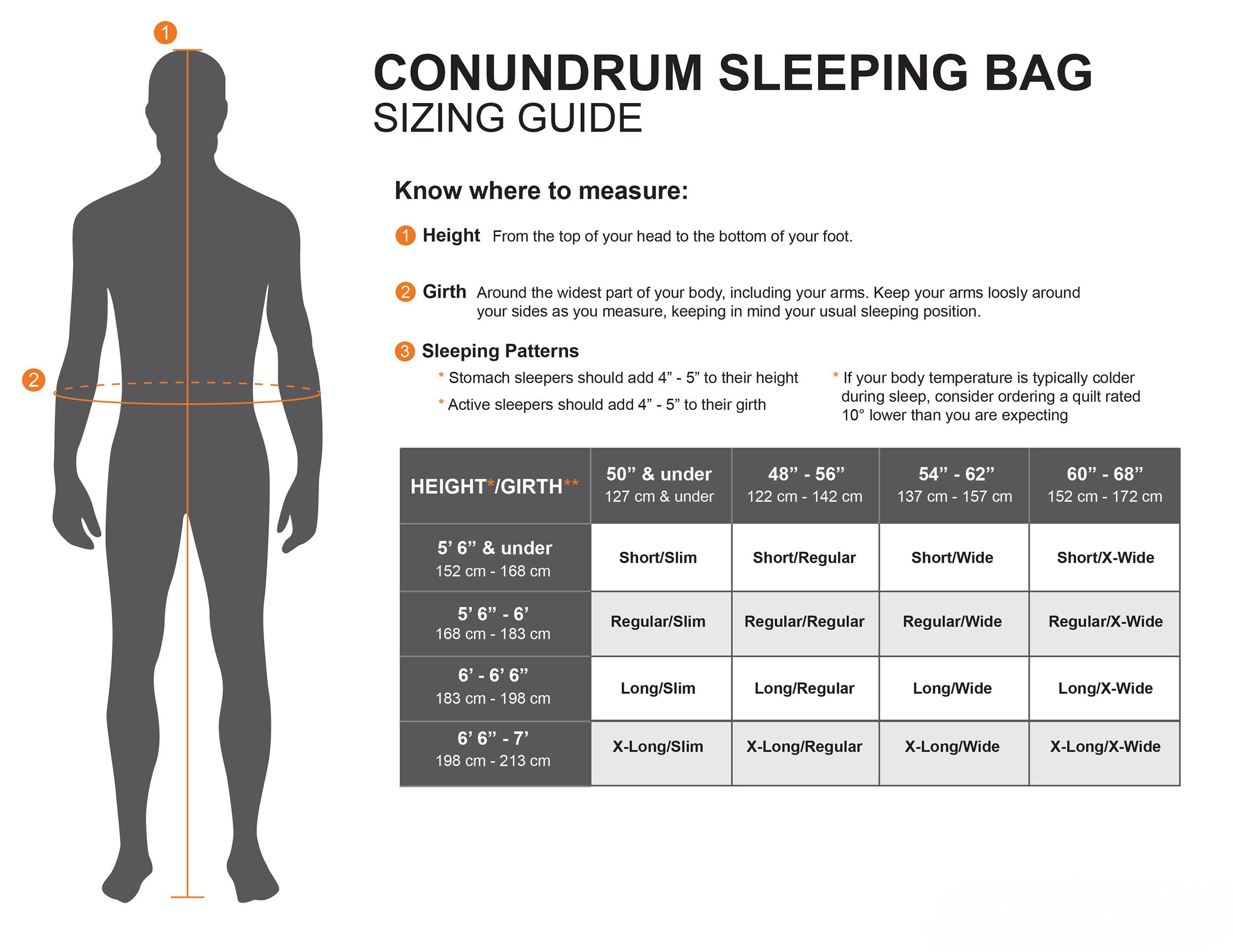 Note: All sleeping bag height and width measurements reference the dimensions of the sewn but not stuffed product. Each product type measures differently based on its design. For sizing related questions, please review our size chart located on the tab above. Unless otherwise noted, this chart reflects the weight of 10D outside and inside fabric.