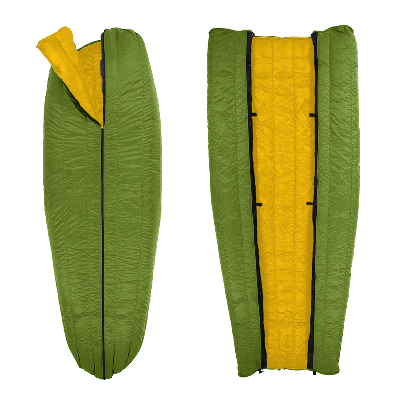 - Full-length zipper and shock cord footbox allow for use as a quilt or sleeping bag.