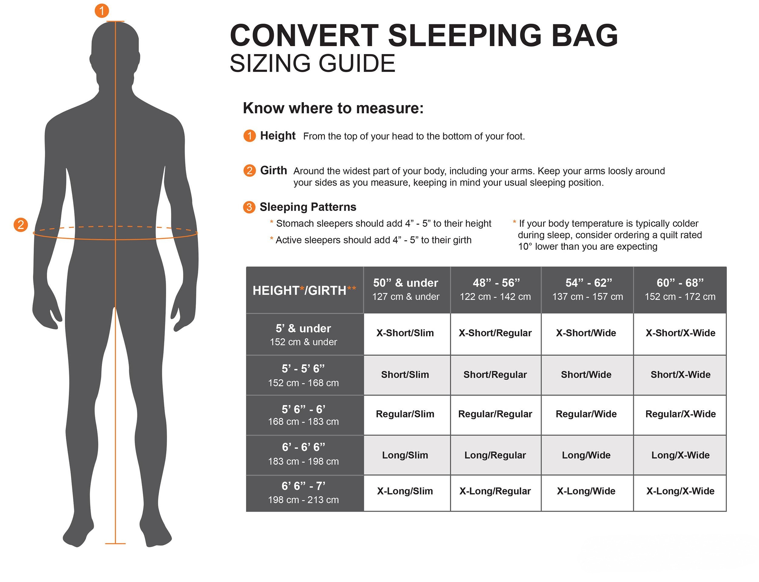 Note: The length measurement below is taken while the sleeping bag is completely open and laid flat. When the sleeping bag is fully closed the length will decrease by 4” - 6”. For sizing related questions, please review our size chart located on the tab above. Unless otherwise noted, this chart reflects the weight of 10D outside and inside fabric.